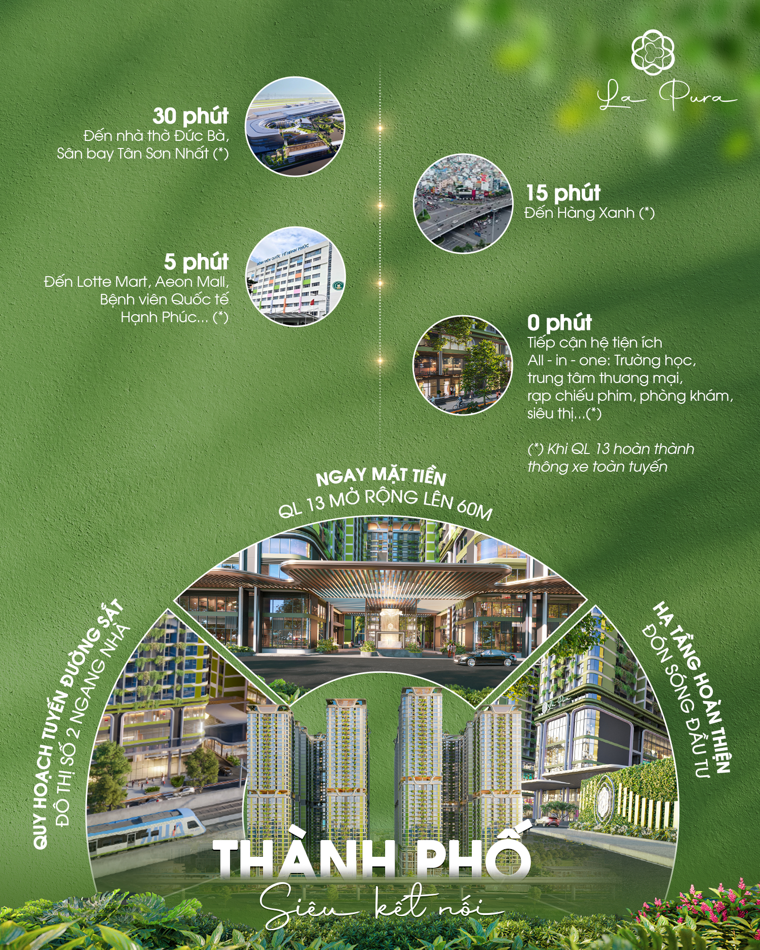 Chỉ cách trung tâm TP.HCM khoảng 30 phút di chuyển, La Pura – biểu tượng sống mới tại QL13 – mang đến một vị trí kết nối lý tưởng và đắt giá bậc nhất khu vực Đông Bắc Sài Gòn. Nằm ngay mặt tiền Đại lộ Đông Bắc TP.HCM, dự án sở hữu khả năng kết nối linh hoạt với các địa điểm trọng yếu trong khu vực:
