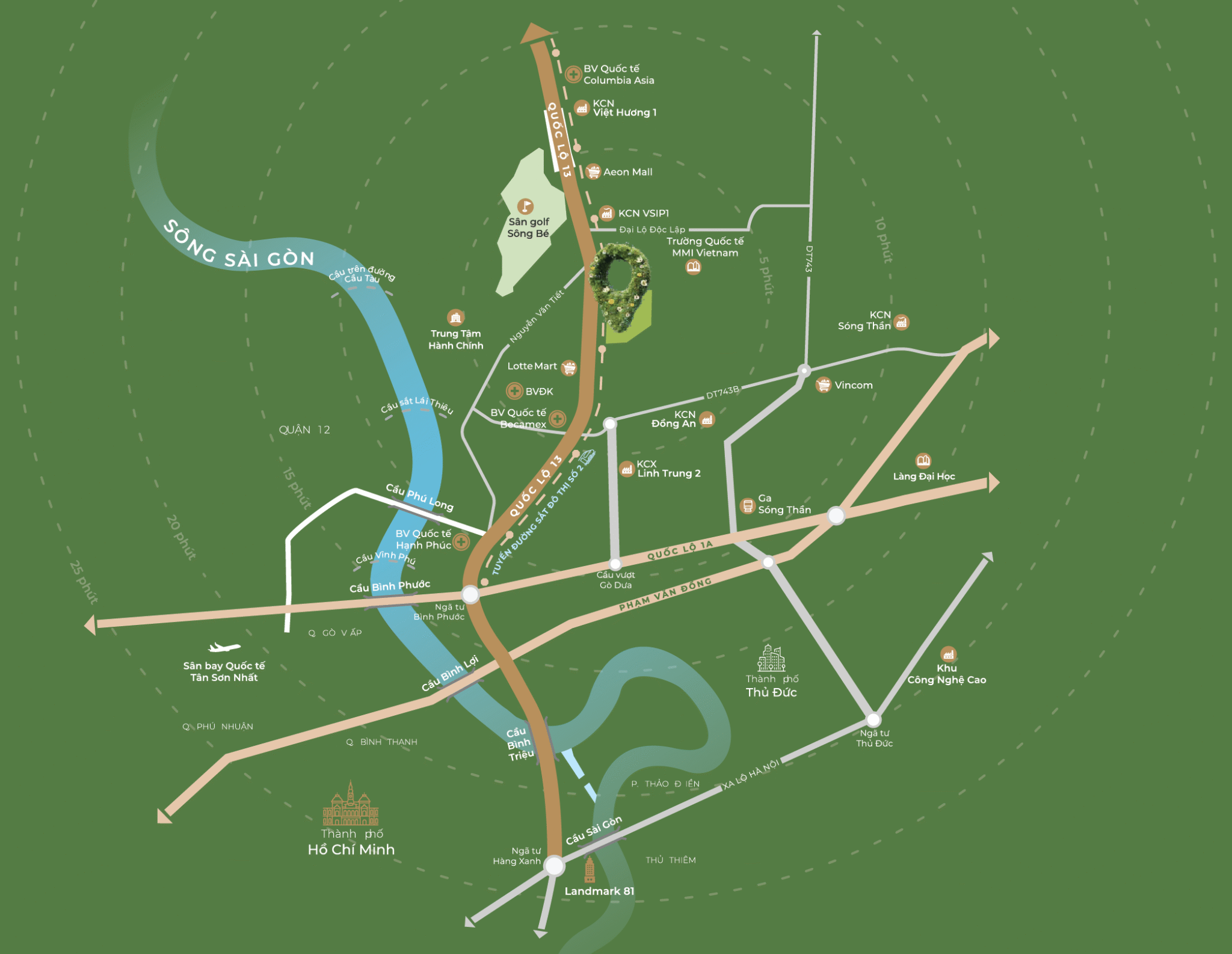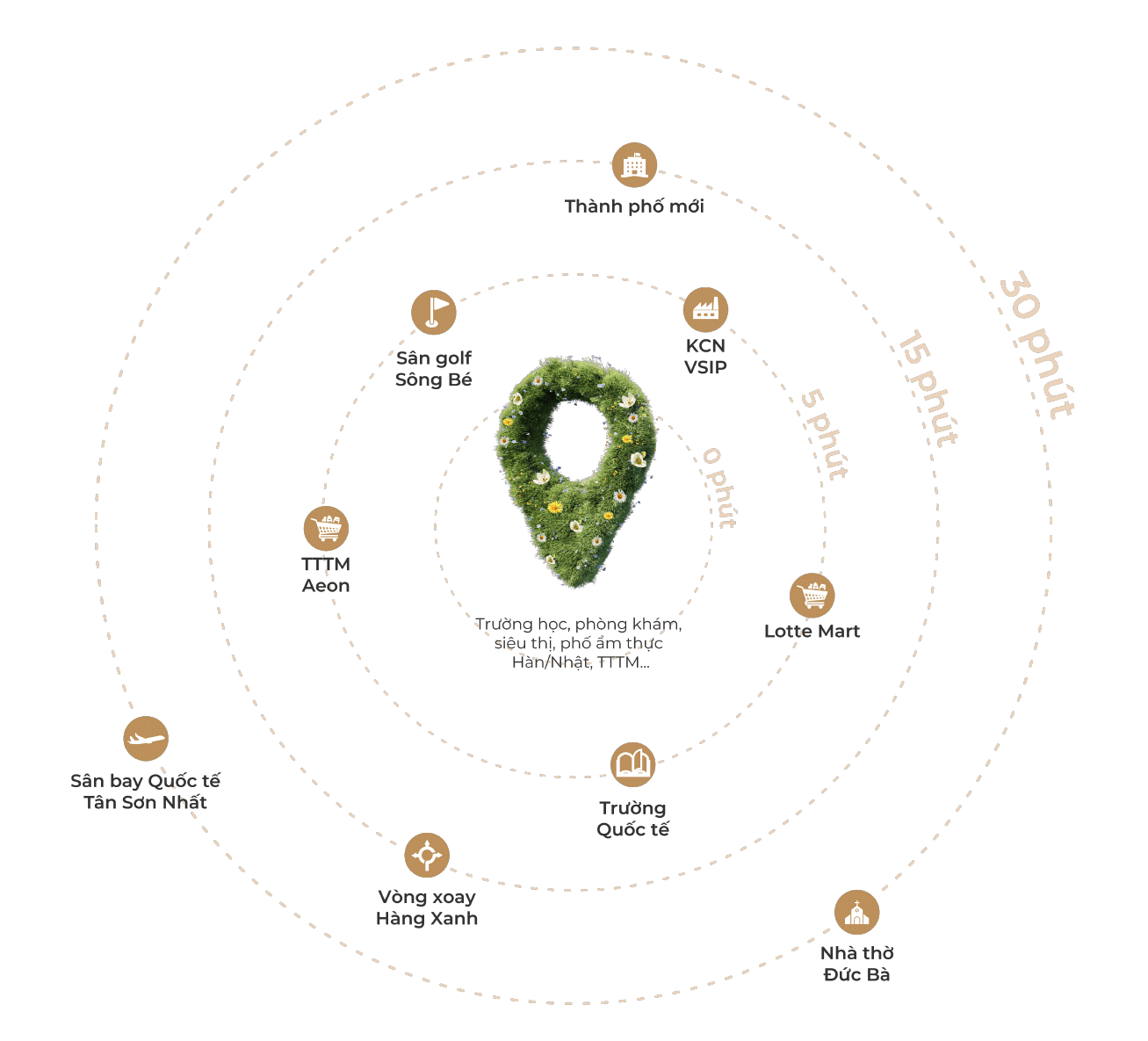 Chỉ 5 phút đến Aeon Mall, Lotte Mart, sân Golf Sông Bé, BV quốc tế Hạnh Phúc.